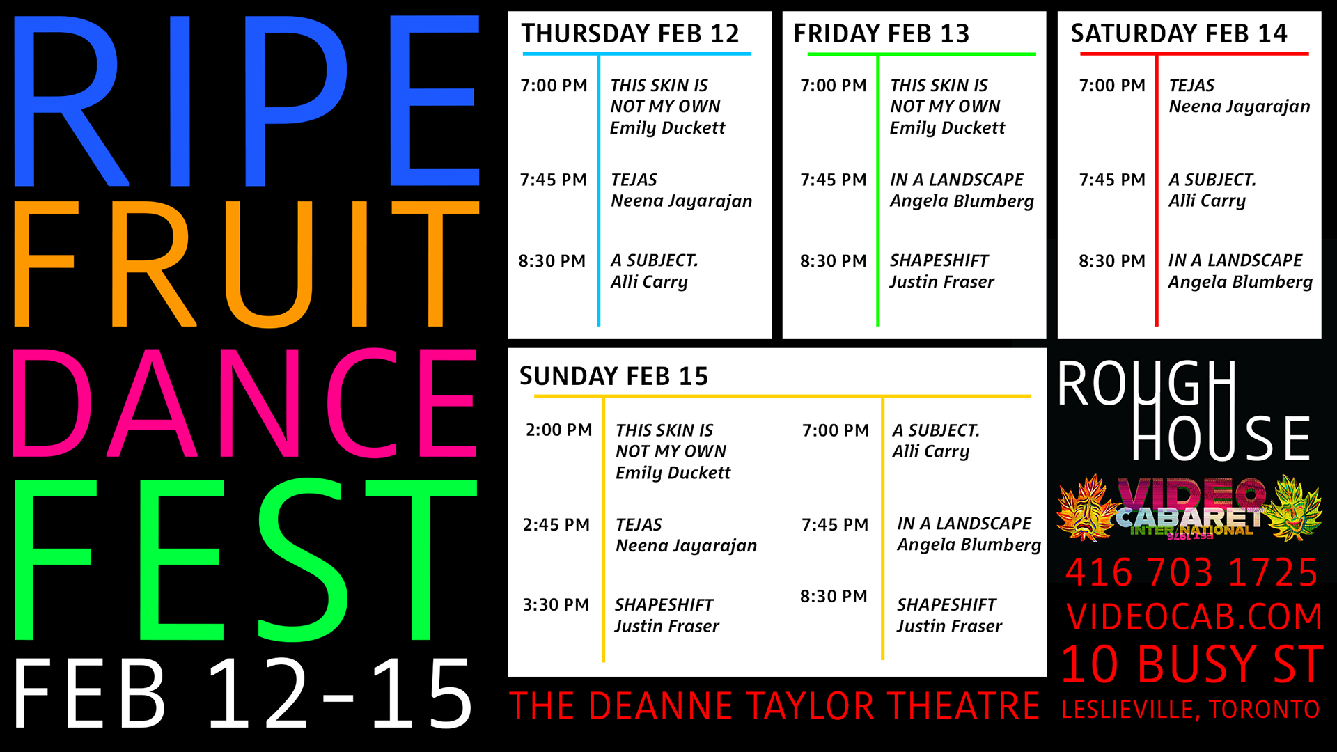VideoCabaret, in collaboration with Rough House Dance, is excited to present the inaugural Ripe Fruit Dance Festival! The Ripe Fruit Dance Festival is a four-day celebration of contemporary dance, featuring bold, physical, and visceral works by five Toronto-based artists and companies.